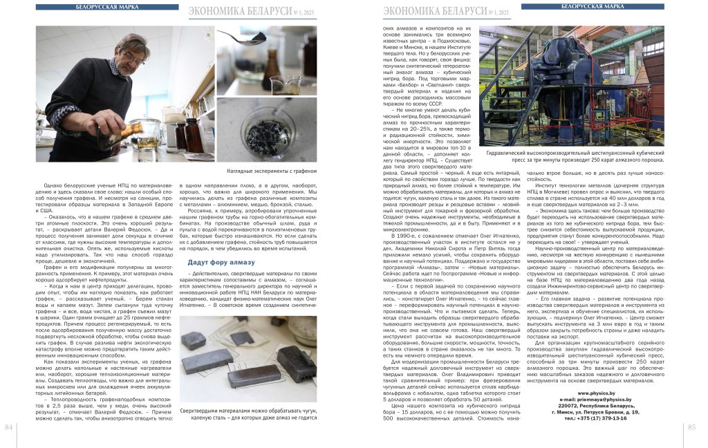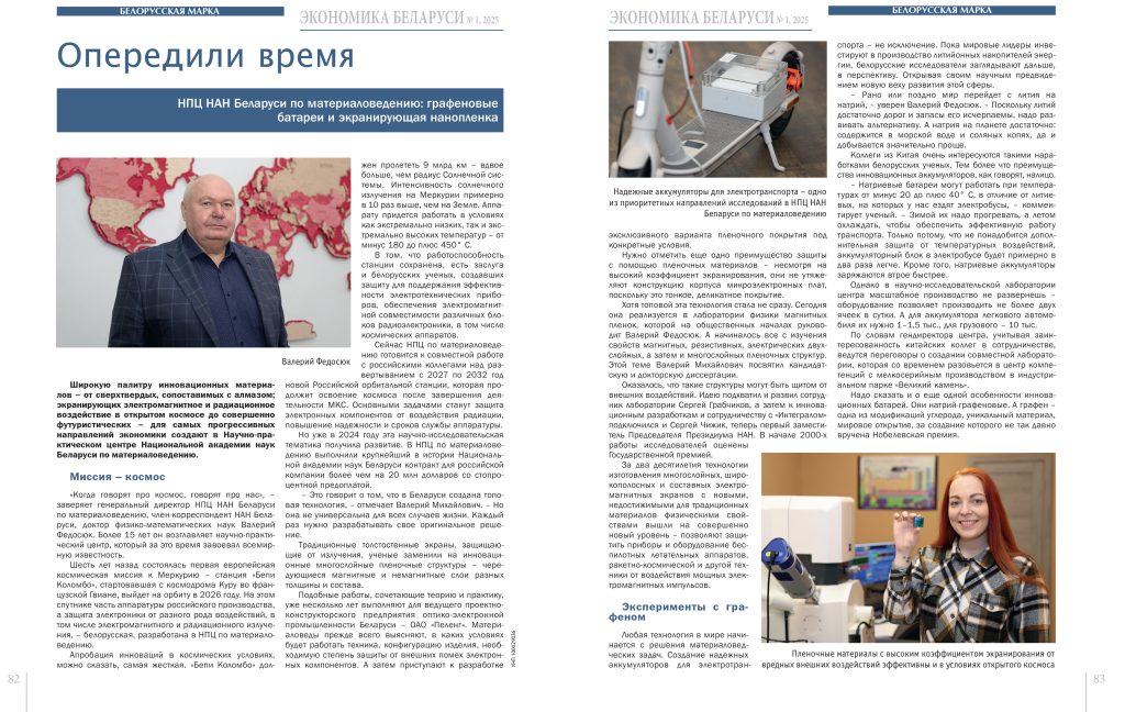 Широкую палитру материалов — от сверхтвердых, сопоставимых с алмазом, или экранирующих электромагнитное и радиационное воздействие в открытом космосе до совершенно футуристических натрий-графеновых батарей для электротранспорта — создают в Научно-практическом центре Национальной академии наук Беларуси по материаловедению. Подробности в интервью журналу «Экономика Беларуси» рассказал генеральный директор, член-корреспондент НАН Беларуси, доктор физико-математических наук Валерий Федосюк.