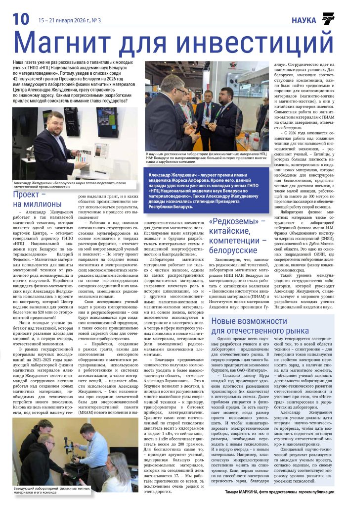 Газета 7 дней уже не раз рассказывала о талантливых молодых ученых ГНПО «НПЦ Национальной академии наук Беларуси по материаловедению». Потому, увидев в списках среди 42 получателей грантов Президента Беларуси на 2026 год имя заведующего лабораторией физики магнитных материалов Центра Александра Желудкевича, сразу отправились по знакомому адресу. Какими прогрессивными разработками привлек молодой соискатель внимание главы государства?